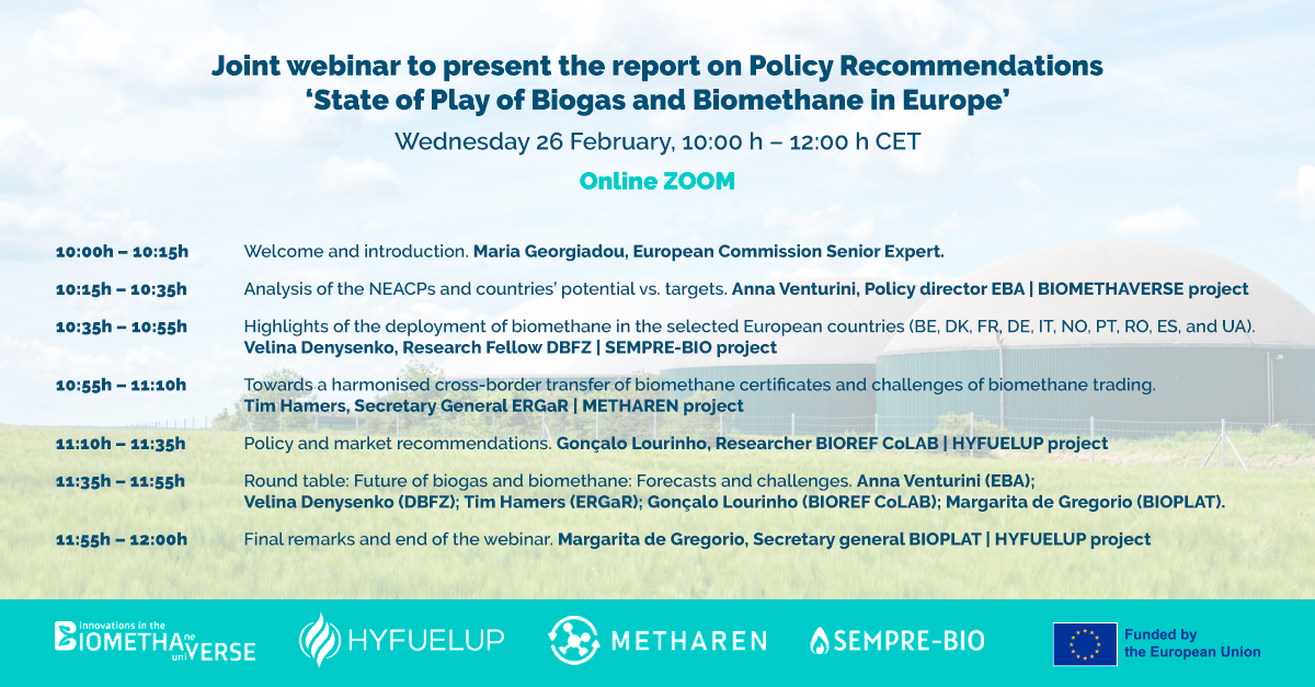 Coinciding with the first communication by the European Commission of the Clean Industrial Deal, the four Horizon Europe projects within the biomethane cluster BIOMETHAVERSE, HyFuelUp, METHAREN and SEMPRE-BIO presented in a webinar on 26 February 2025 the main conclusions of their second joint report, entitled ‘State of Play of Biogas and Biomethane in Europe: An Update on Market Gaps and Policy Recommendations’, which analyses the gaps in the biogas and biomethane market in Europe and proposes policy recommendations for the sector.