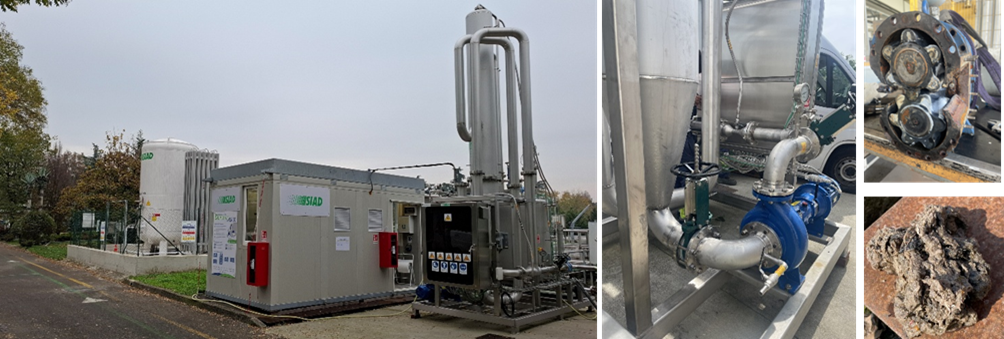 Impianto di ozonolisi (serbatoio di ossigeno, contenitore generatore di ozono e reattore a contatto); ottimizzazione idraulica; manutenzione della pompa di alimentazione; materiale fibroso dei fanghi nel circuito idraulico dell’impianto.