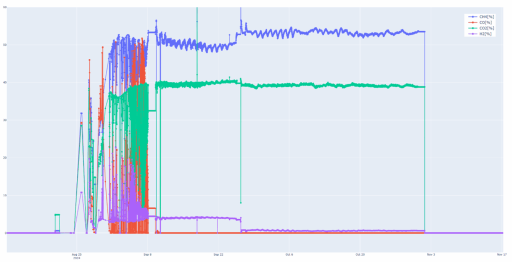 Produktgaskvalité för biogas producerad via biologisk metanisering av syngas i piloten i Höganäs hösten 2024. Efter en uppstartsperiod då mikroorganismerna etablerades och växte till i bioreaktorerna (augusti) kunde fullständig och stabil omsättning av CO och H2 demonstreras i knappa två månader. Produktgasen uppnådde en metanhalt på 50% och mindre än 1% CO och H2. I slutet av september kalibrerades gasanalysinstrumentet vilket förklarar den stegvisa förändringen i gaskvalitén.
